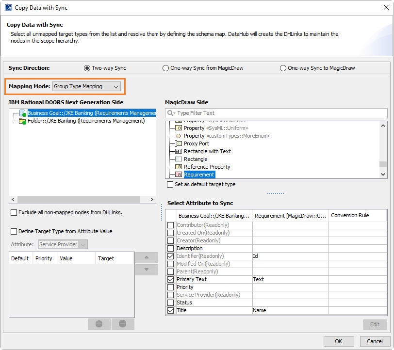 - The Copy Data with Sync dialog appears. From the Mapping Mode drop-down list, choose Individual Type Mapping or Group Type Mapping.
