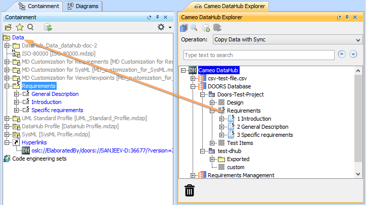 - Drag a data node in a DOORS or DOORS Next Generation Data Source from DataHub Explorer to the modeling tool's Containment tree.