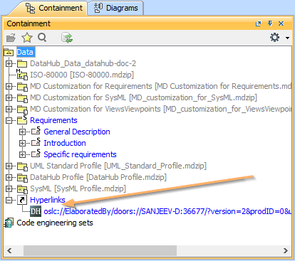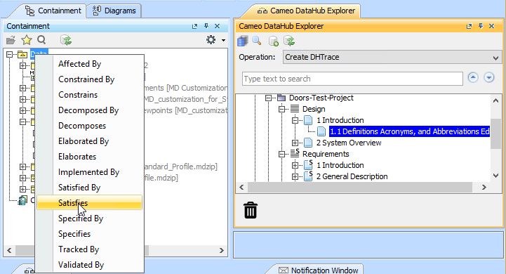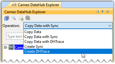 In the 19.0 and later versions, the Create OSLC link operation is not displayed and is used through the Create DHTrace operation instead from the Operation drop-down list in Cameo DataHub Explorer (for IBM® Rational® DOORS® Next Generation Data Source).