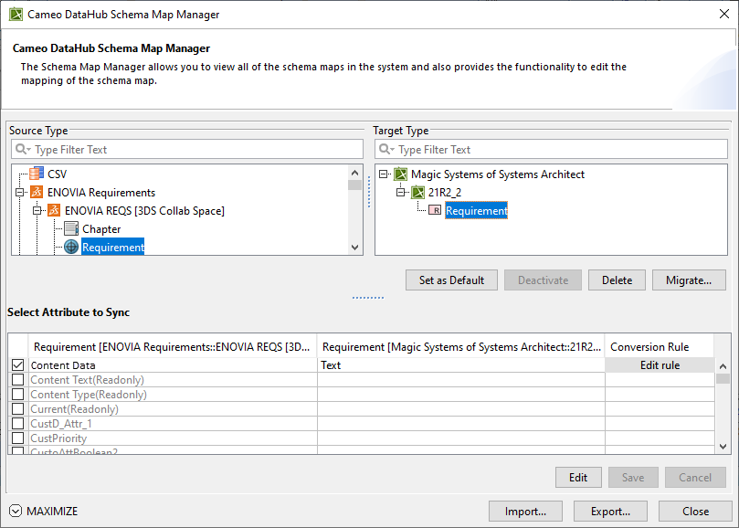 Sets the current schema configuration as the default one. After clicking, the button changes to Remove Default. Clicking Remove Default removes the schema configuration from the selected source and target types.