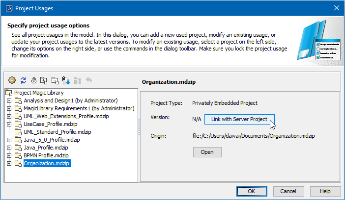 Select Project Usages > Project Usage Options. The Project Usages dialog opens. The embedded project is already selected.