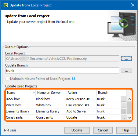 - To update a main project and used projects with changes from the server project file, you must have read-write permission for all branches requiring updates.