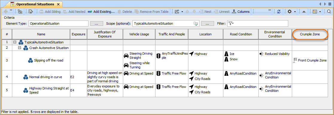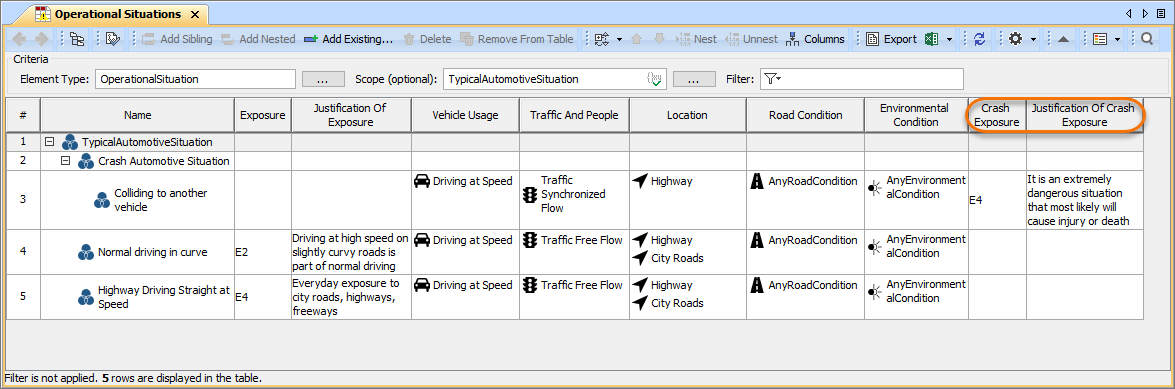 You have created a new type of Operational Situation (e.g., Crash Automotive Situation) with a custom Exposure property (e.g., crashExposure). Now you can add new columns for this property in an Operational Situations Table as displayed in the following figure.