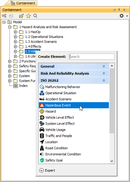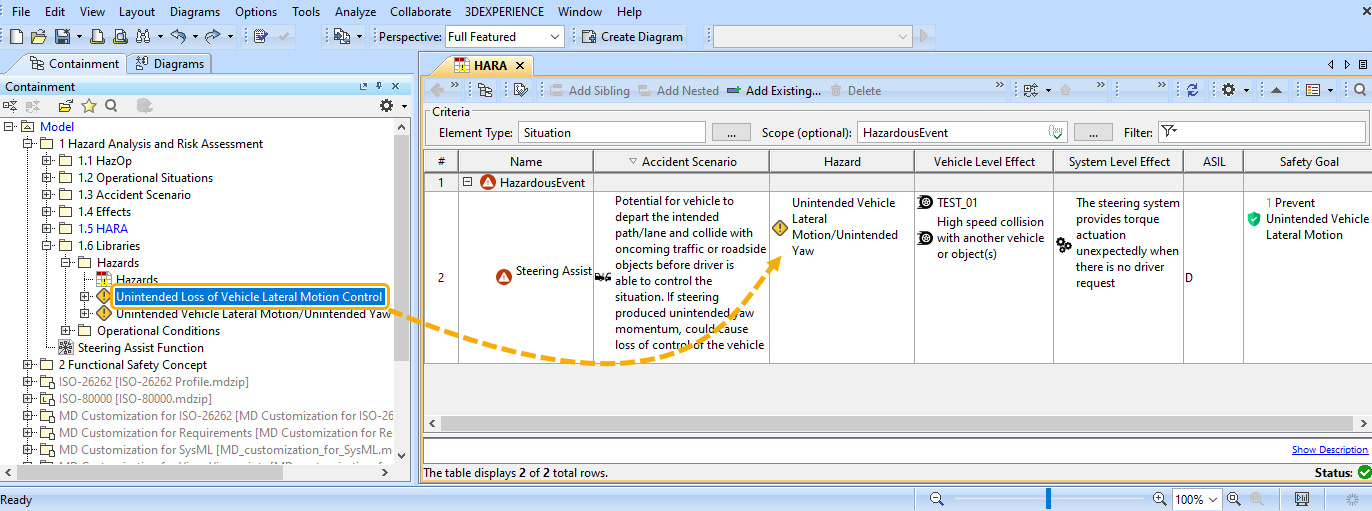 After creating a Hazardous Event, you need to define it by assigning an Accident Scenario, Hazards, and Effects to the element. You also need to create and assign a Safety Goal. The Accident Scenario, Hazards, Effects and Safety Goal also can be dragged from the Containment tree.