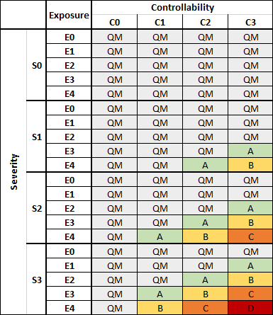 ASIL returns a calculated value according to the specified values of Exposure, Controllability and Severity. If there are more than one values of Severity or Exposure then take the higher value (single value).