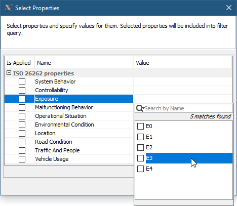 next to the Filter by ISO properties box. - In the Select Properties dialog, click the Value box of a property and select the desired property value from the list.