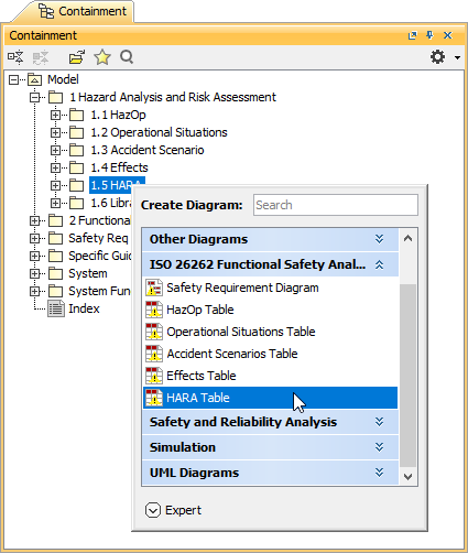 - In the Containment tree, right-click the owner of the table, select Create Diagram and select HARA Table in an open dialog.