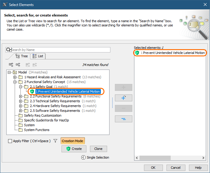 - In the element tree on the left side of the dialog, select the owner of a Safety Goal and click the Create button.