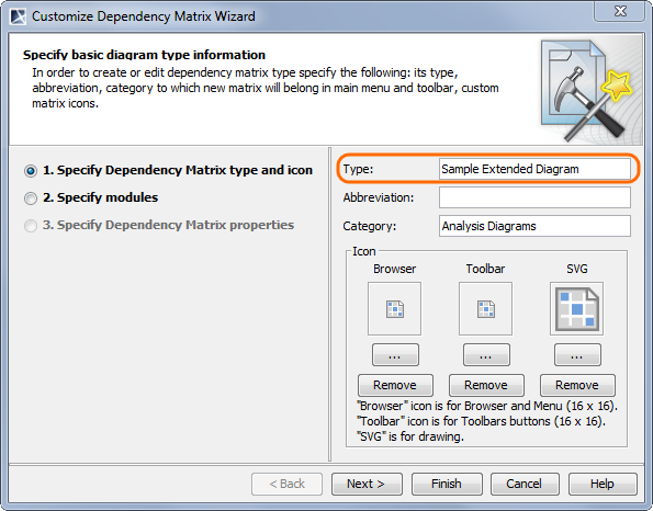 Remember the name of the new dependency matrix type that you pass as an argument while creating a new instance of the DependencyMatrixConfigurator class (in the preceding example, it is “Sample Extended Matrix”). You will have to specify the exact name when registering a new diagram type.