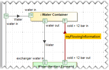 Additionally, it is possible to display animation for the information that flows via connector from one end to another. For a fixed amount of time, a banner with the custom value will move from the source towards the target. During the full duration of the animation, the connector presentation element will be highlighted in color which is controlled by a project option Active Color.