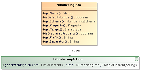 The com.nomagic.magicdraw.autoid.NumberingInfo support object. This is an immutable Java Bean object which provides the implementer of the INumberingAction interface with all the information as defined in the AutoNumber and NumberingScheme objects: