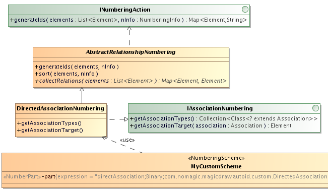 A more complicated example can be found the OpenAPI packages com.nomagic.magicdraw.autoid and com.nomagic.magicdraw.autoid.custo. It shows an implementation that creates numbers for elements connected through UML Relationships. The UML diagram shows the com.nomagic.magicdraw.autoid.custom.DirectedAssociationNumbering class, which is customized to number element types that are connected by «DirectedAssociation» links.