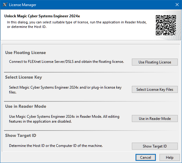 When you need to change the license key file or obtain a floating license, you can open the License Manager dialog from the modeling tool menu (Help > License Manager).