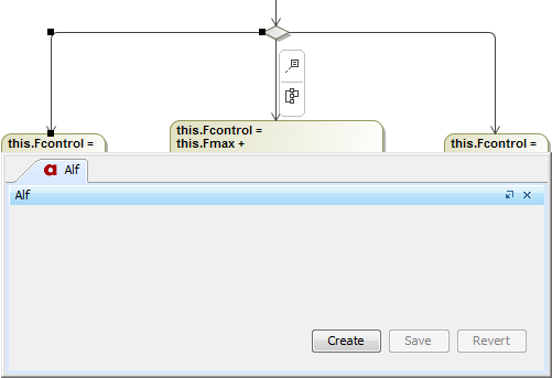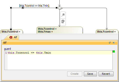 The Alf code for a guard Expression can also be entered or edited directly in the Guard property in the Specification window of the Activity Edge. If you open the Edit Guard window, then the Alf code can be edited just as in the Alf editor window. However, instead of Save and Revert buttons, this window has OK and Cancel buttons, either of which will close it. If you press OK, then the Alf text is saved, and, if it has no errors, compiled. If you press Cancel, the Alf text is not saved.