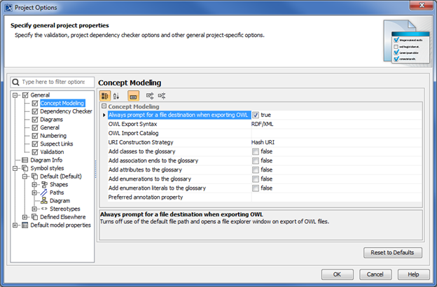 For more information about changing the OWL export location, see Exporting a Concept Model to an OWL ontology.