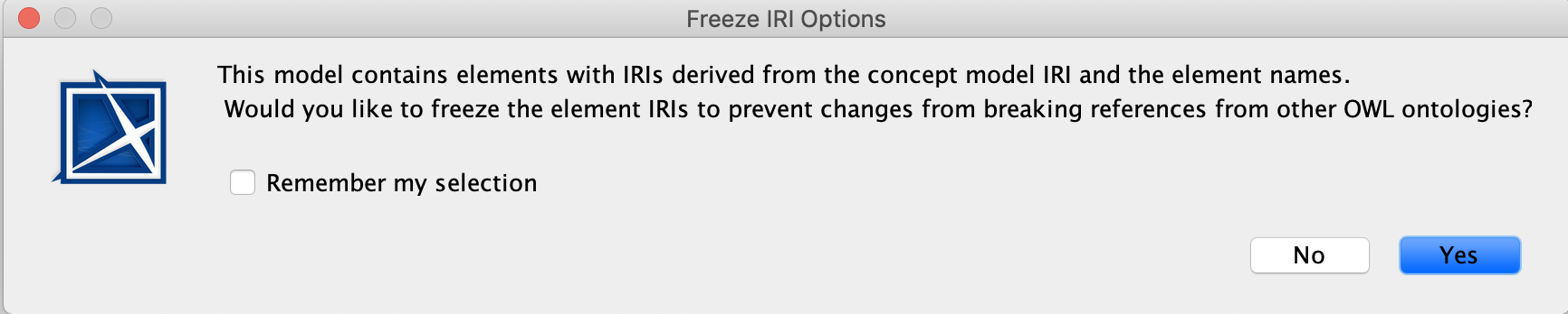 - A dialog box will appear asking whether or not you want to freeze the elements' IRIs. This dialog will show only if there are elements with no IRI tagged value.