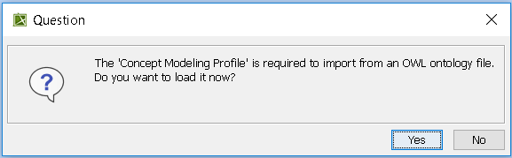 Cameo Concept Modeler comes with its own Default Styles. This message dialog may appear after the Question dialog shown previously. The dialog simply asks whether you would like to load CCM default styles. Note the Warning message in the dialog. The message is there for projects that are really specific and may contain nomenclature that CCM does not recognize.