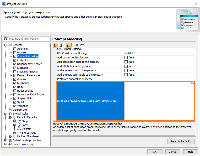 - In the tree structure on the left, expand General and select Concept Modeling.
