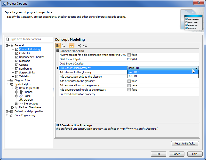 To select a concept model export URI style for a MagicDraw project