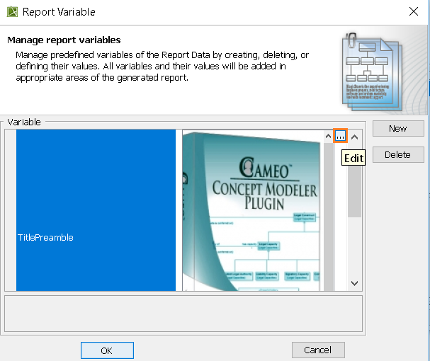 Remaining in the same Report Variable dialog, refer to the next set of instructions to see how to change the TitlePreamble. By default, the TitlePreamble is a hyperlinked image of the CCM plugin linked to the CCM website. If you would like to read more about the Report Variable dialog, please refer to the Report Data Management Pane.