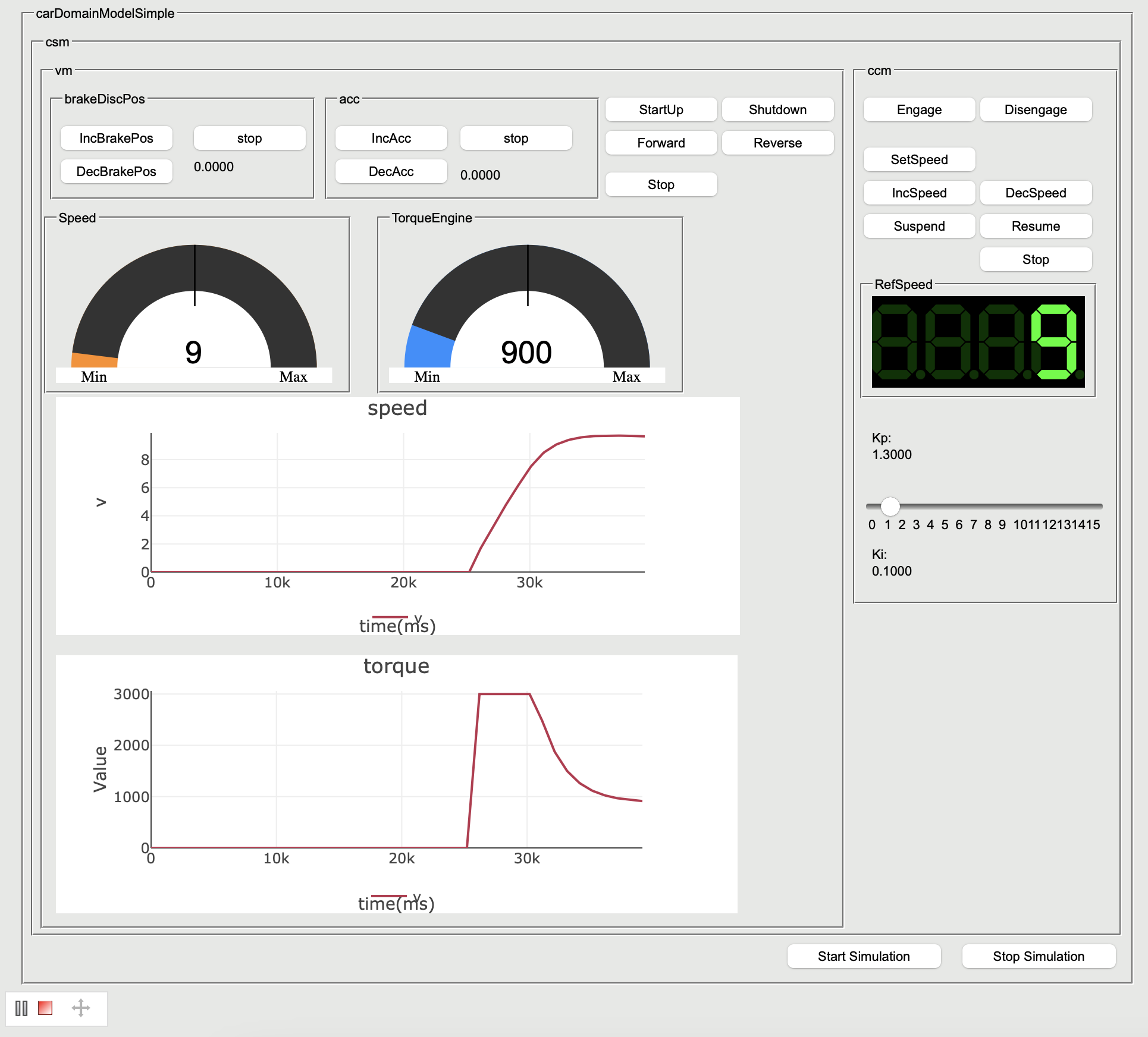 The Cruise Control Widgets sample project demonstrates server-side simulation with a specified HTML UI mockup that includes widgets. With this project, you can open the HTML UI window during model execution.