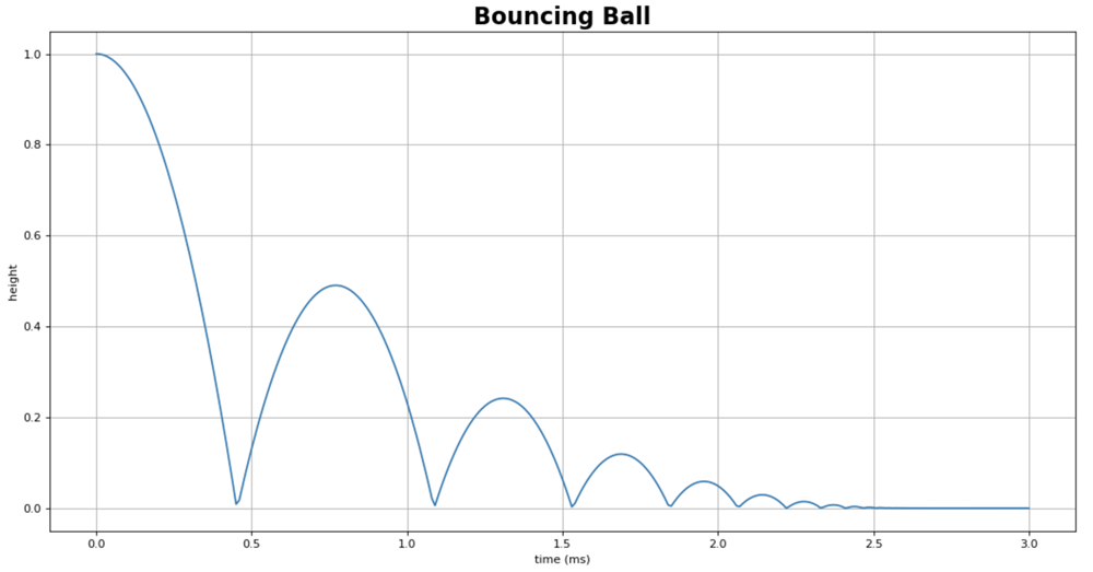 import numpy as np import matplotlib.pyplot import figure from io import StringIO figure(figsize=(16, 8), dpi=80 x = np.loadtxt(StringIO(csv), dtype='double', delimiter=',', skiprows = 1, usecols = (0)) / 1000 y = np.loadtxt(StringIO(csv), dtype='double', delimiter=',', skiprows = 1, usecols = (1)) plt.xlabel('time (ms)') plt.ylabel('height') plt.title('Bouncing Ball', fontweight="bold", fontsize=20) plt.plot(x, y,) plt.grid() plt.show()CODE