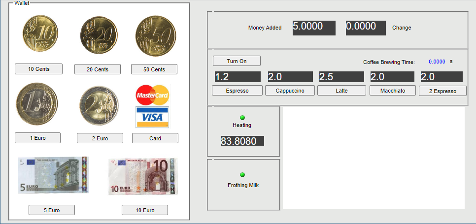 The Coffee Machine sample project demonstrates server-side simulation with a specified HTML UI mockup. With this project, you can open the HTML UI window during model execution.