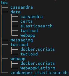 mkdir -p twc/{cassandra,data/{cassandra,certs,elasticsearch,twcloud,webapp},messaging,twcloud/{docker.scripts,twcloud},webapp/{docker.scripts,WebAppPlatform},zookeeper_elasticsearch}