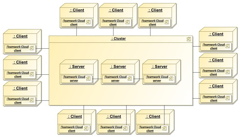 A cluster consists of multiple servers connected through LAN, acting as a single repository. A server is a single computer which is part of a cluster and a client is a computer running, for example, MagicDraw, that accesses data in a repository, but is not part of the cluster.