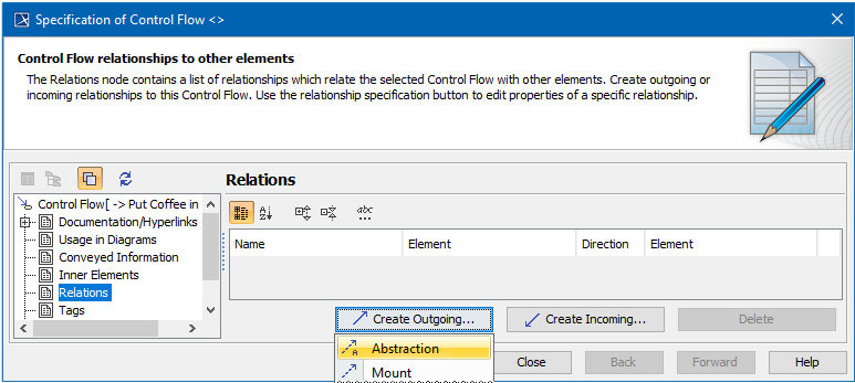 An Abstraction can be specified by changing its property values in the Abstraction Specification window. Each property is described in the description area in the Specification window.