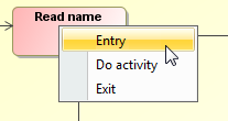 If you do not see the Behavior Type property, click the + button near the Entry, Do Activity, or Exit category to expand its content.According to the selected behavior type, the Behavior Element value is defined automatically. Additional properties Name and Owned Diagram appears. Specify these properties if it is needed.