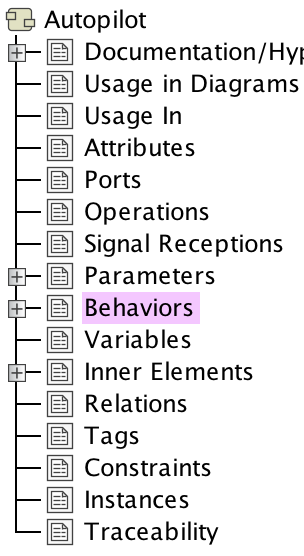 In the element's Specification Window, click Behaviors property group.