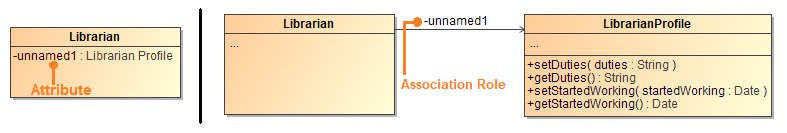 - On the diagram pane, the Attribute is represented as an association with a role.