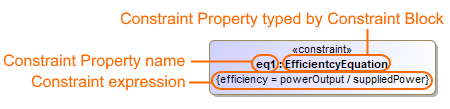 A Constraint Property is a property that specifies the constraints of other properties in its containing Block. Every Constraint Property has composite AggregationKind and is typed by a Constraint Block. Constraint Properties are displayed in the constraints compartment on a Block shape.