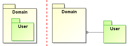 Example of package nesting (on the left) and package nesting using containment relationship (on the right)