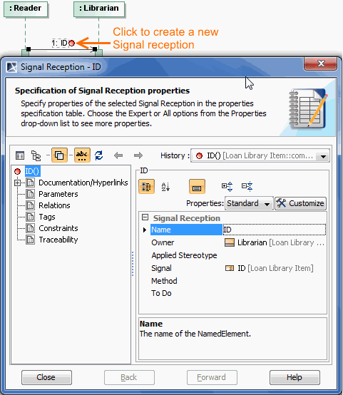 Click the button in the shape of a small red circle at the end of the Message name. Define the Signal reception property values in the Signal reception Specification window. The default name of the Signal reception is the name of the Message for which the Signal reception is being created.