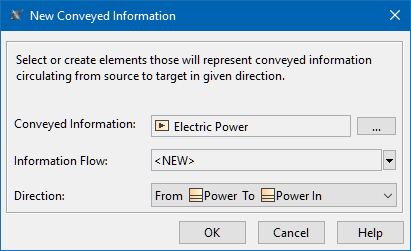 - In the diagram palette, select the needed Conveyed Information (e.g., Class) and drag it onto the Information Flow on the diagram pane.In the New Conveyed Information dialog, specify Conveyed Information, Information Flow, Direction and click OK.