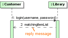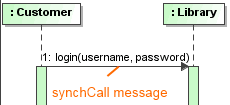 | synchCall | The Message was generated by a synchronous call to an Operation. Synchronous Messages can overtake each other. When a Message represents an Operation, the arguments of the Message must correspond to the parameters of the Operation. | ![]() |
