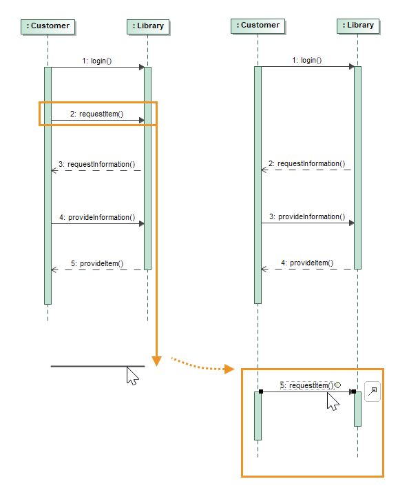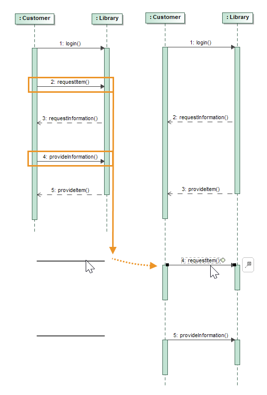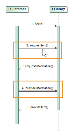 - (Optional) Drag the Messages above or below their execution specification to break the Messages off their execution specification and connect them to the new ones.