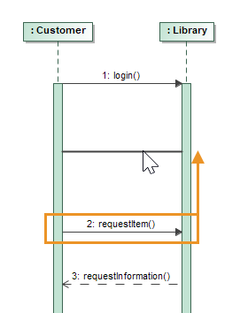 You can also move a Message together with its dependent Messages up or down the lifeline by dragging it along its execution specification. If the Message is dragged above or below its execution specification, the latter will break and the Message, along with its dependent Messages, will be connected to the new execution specifications.