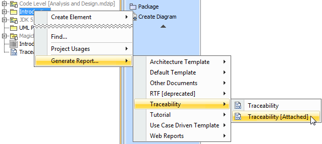 - Right-click the namespace (for example, a Package) in the Containment tree. From the shortcut menu select Generate Report. Then select the appropriate report templates category and click the attached report template.