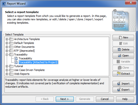 - Select the report template you want to attach to the project and click the Attach button. The selected report template is duplicated, and the duplicate is attached to the open project. It is visible in the Containment tree directly under the root package. As the following figure shows, in the Report Wizard dialog it as marked with the “[Attached to Project]” tag.