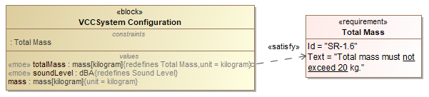 A 'Satisfy' relationship is a dependency between a requirement and a model element that fulfills that requirement. As with other dependencies, the arrow direction points from the satisfying (client) model element to the (supplier) requirement that is satisfied.