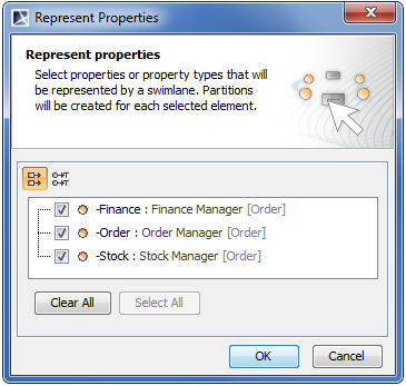 and then click an empty space on the diagram pane.If the Represent Properties dialog opens, select the properties you want to display as Swimlanes in the diagram (see the following figure) and click OK. Otherwise, a few empty Swimlanes are created.