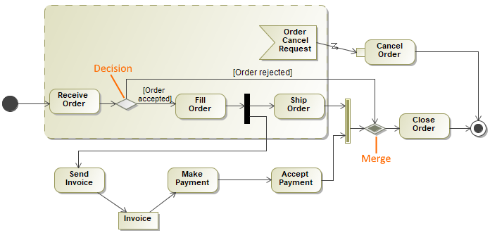 Activity diagram illustrates that when an order cancellation request is made (only while filling, receiving or shipping orders) - the Cancel Order behavior is invoked.