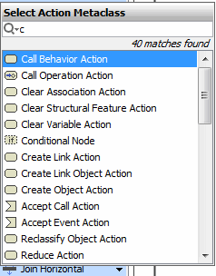 Select an Action metaclass from the list, or type the first letter of the metaclass in the Quick filter box. Click OK. The Action is created.