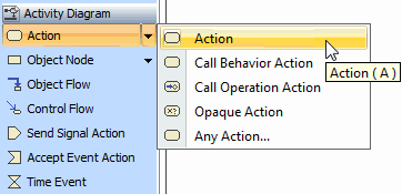- In the Activity diagram toolbar, right-click or expand the Action button. The menu opens.
