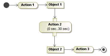 The following sample depicts a fragment of the Activity diagram with a duration constraint applied on the Action.