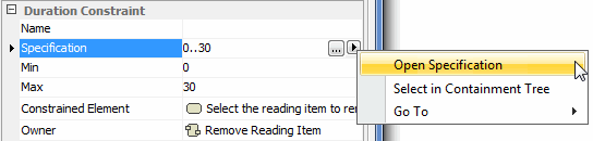 In the opened Duration Constraint Specification window, click the Specification property specification cell, and click the Show Shortcut Menu button