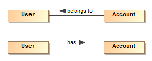 As shown in the following figure, User and Account Classes are connected with the Association. A navigation arrow can be displayed on either side depending on the Association name. If the association name is belongs to, the Direction Arrow should point from the Account to the User. If the Association name is has, the Direction Arrow should point from the User to the Account.